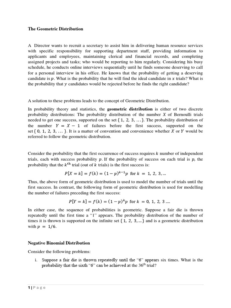 needed to get one success, supported on the set { 1, 2, 3, . . . }. The probability distribution of