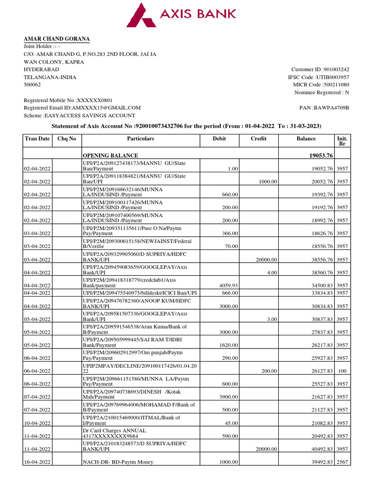Statement of Axis Account No :920010073432706 for the period (From : 01-04-2022 To : 31-03-2023)