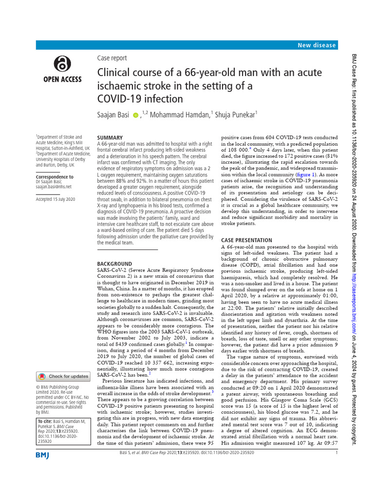 understanding COVID-19, as he presented with an ischaemic previously had an ischaemic stroke illustrates a prior suscepti-
