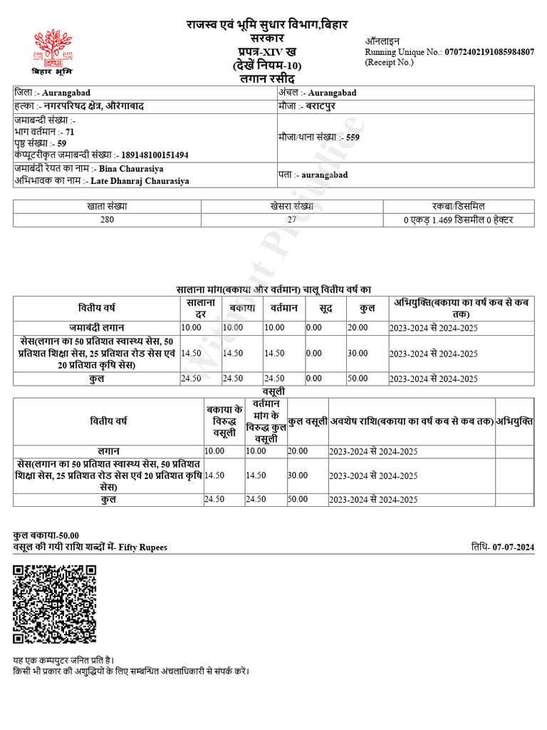 वसूल की गयी राशि शब्दों में- Fifty Rupees तिथि- 07-07-2024
