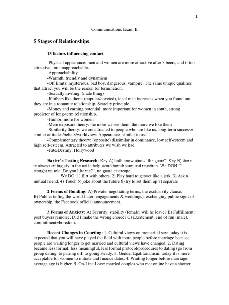 13 factors influencing contact -Physical appearance: men and women are more attractive after 3 beers, and if too attractive, too unapproachable. -Approachability -Warmth, friendly and dynamism -Off limits: mysterious, bad boy, dangerous, vampire. The same unique qualities that attract you will be the reason for termination. -Sexually inviting: (male thing) -If others like them: (popular/coveted), ideal man increases when you found out they are in a romantic relationship. Scarcity principle. -Money and earning potential: more important for women in south, strong predictor of long-term relationship. -Humor: more for women -Mere exposure theory: the more we see them, the more we like them -Similarity theory: we are attracted to people who are like us, long-term success= similar attitudes/beliefs/worldview. Appearance- similar to us. -Complementary theory: (opposite) dissimilar in dominance, low self-esteem and high self-esteem. Attracted to attributes we wish we had. -Fate/Destiny: Hollywood Baxters Testing Research: Key A) both know about the game. Key B) there is always ambiguity in the act to help avoid humiliation and rejection. We DONT: straight up ask Do you like me?, no game or escape. We DO: 1) flirt with others. 2) Play hard to get/act like a jerk. 3) Ask a mutual friend. 4) Touch 5) joke about the future 6) try to set them up 7) separate 2 Forms of Bonding: A) Private: negotiating terms, the exclusivity clause. B) Public: telling the world (later: engagements & weddings), exchanging public signs of ownership, the Facebook official announcement. 3 Forms of Anxiety: A) Security: stability (female) will he leave? B) Fulfillment: post buyers remorse, Did I make the wrong choice? C) Excitement: end of fun (male), commitment=boredom. Recent Changes in Courting: 1. Cultural views on premarital sex: today it is expected that you will have played the field with more people before marriage because people are waiting longer to get married and cultural views have changed. 2. Dating became less formal: less meaningful, less formal protocol/procedures to dating (go from group dating, to pairing off, to going steady. 3. Gender Egalitarianism: today it is more acceptable for women to initiate and finance dates. 4. Waiting longer before marriage: average age is higher. 5. On-Line Love: married couples who met online have a shorter