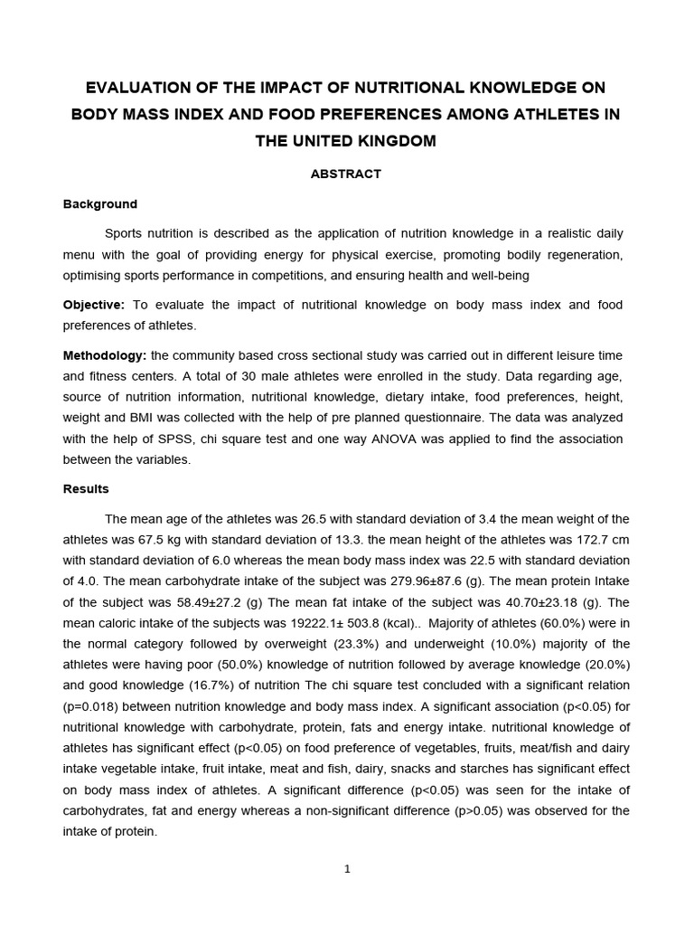(p=0.018) between nutrition knowledge and body mass index. A significant association (p<0.05) for