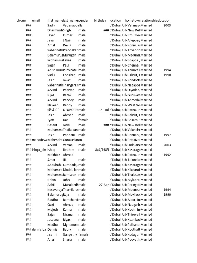 phone email first_namelast_name gender birthday location hometownrelationshieducation_