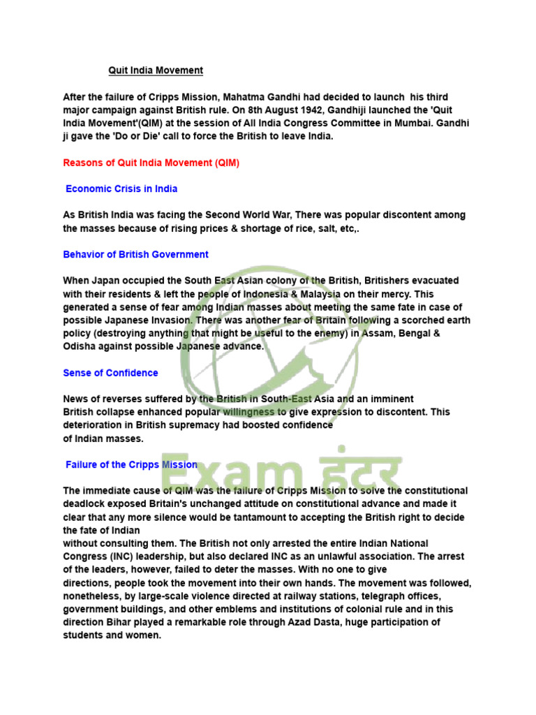 The immediate cause of QIM was the failure of Cripps Mission to solve the constitutional