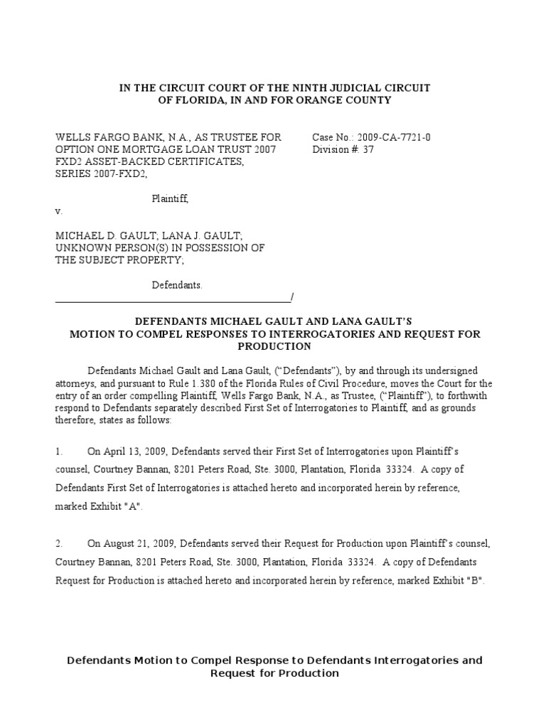 N.A., AS TRUSTEE FOR OPTION ONE MORTGAGE LOAN TRUST 2007 FXD2 ASSET-BACKED CERTIFICATES, SERIES 2007-FXD2, Plaintiff, v. MICHAEL D. GAULT; LANA J. GAULT; UNKNOWN PERSON(S) IN POSSESSION OF THE SUBJECT PROPERTY; Defendants. ____________________________________________/ DEFENDANTS MICHAEL GAULT AND LANA GAULTS MOTION TO COMPEL RESPONSES TO INTERROGATORIES AND REQUEST FOR PRODUCTION Defendants Michael Gault and Lana Gault, (Defendants), by and through its undersigned attorneys, and pursuant to Rule 1.380 of the Florida Rules of Civil Procedure, moves the Court for the entry of an order compelling Plaintiff, Wells Fargo Bank, N.A., as Trustee, (Plaintiff), to forthwith respond to Defendants separately described First Set of Interrogatories to Plaintiff, and as grounds therefore, states as follows: 1. On April 13, 2009, Defendants served their First Set of Interrogatories upon Plaintiffs Case No.: 2009-CA-7721-0 Division #: 37