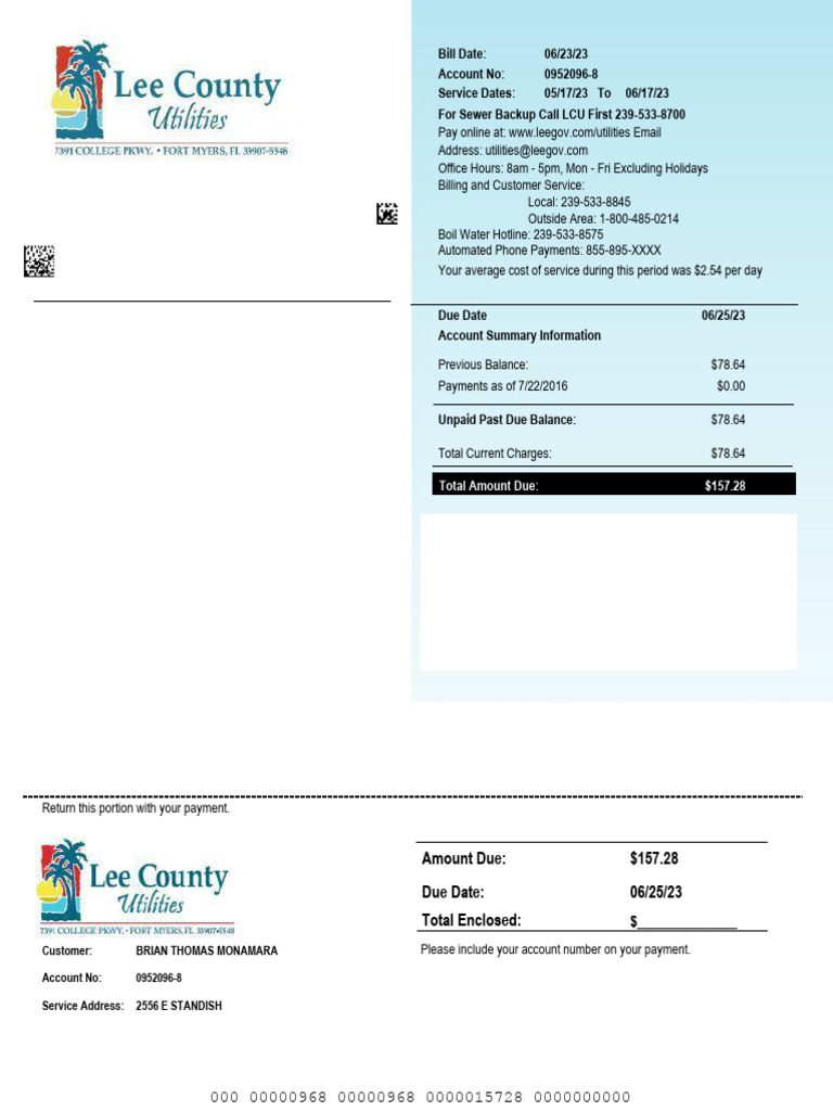 2. Lee County Utilities Contact Information: Use this Previous Balance: $78.64