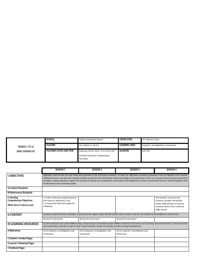 TEACHER Ma. Arlene T. Vecino LEARNING AREA Inquiries, Investigations, Immersion