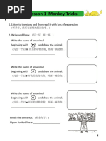1。认读“猴、结、掰、扛、满、扔”6个 生字。 Xiǎo hóuzi kángzhe yùmǐ, zǒu dào yī kē táo shù xià. Tā kànjiàn mǎn
