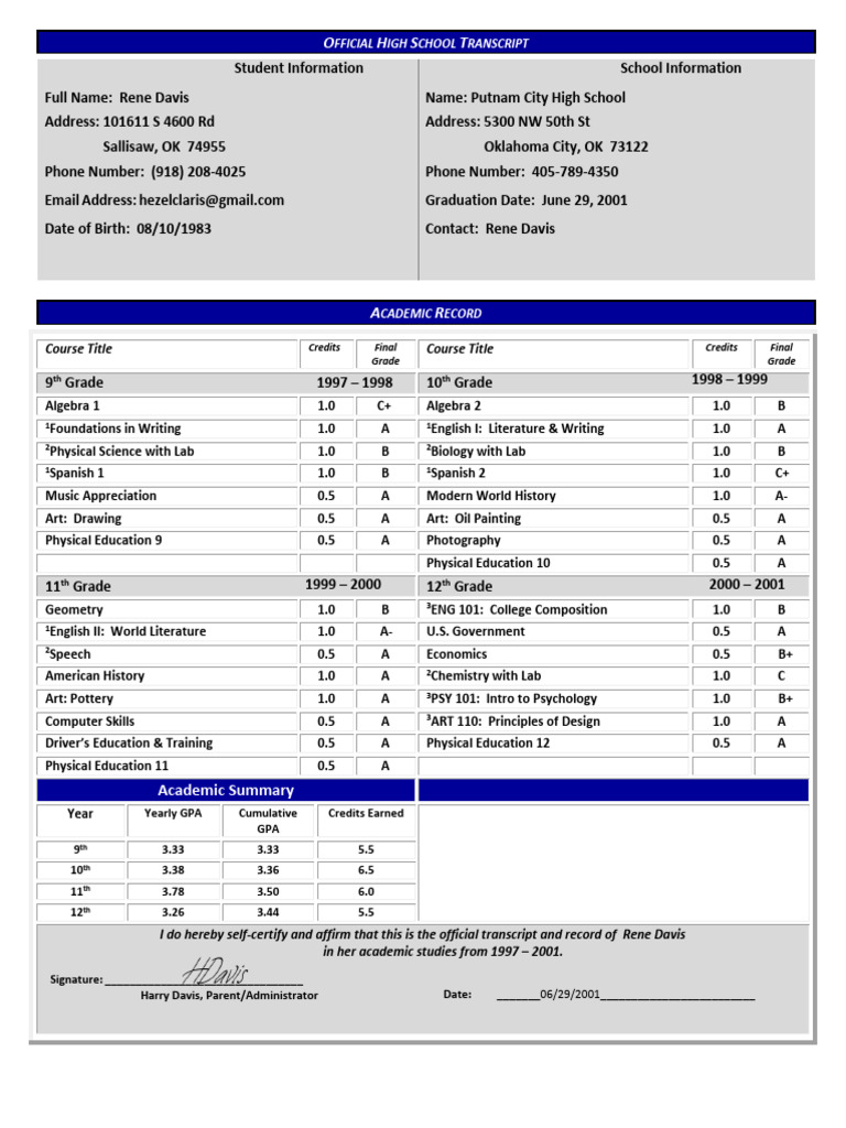 I do hereby self-certify and affirm that this is the official transcript and record of Rene Davis