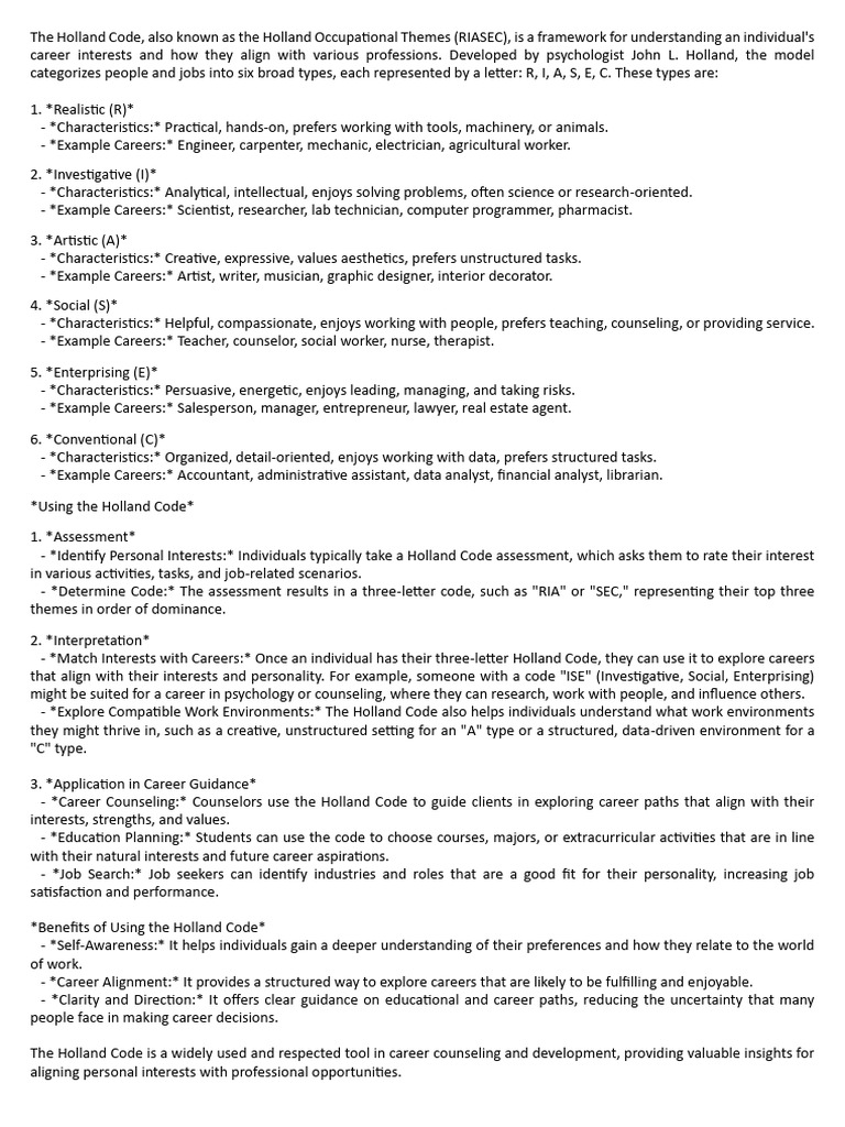 The Holland Code is a widely used and respected tool in career counseling and development, providing valuable insights for