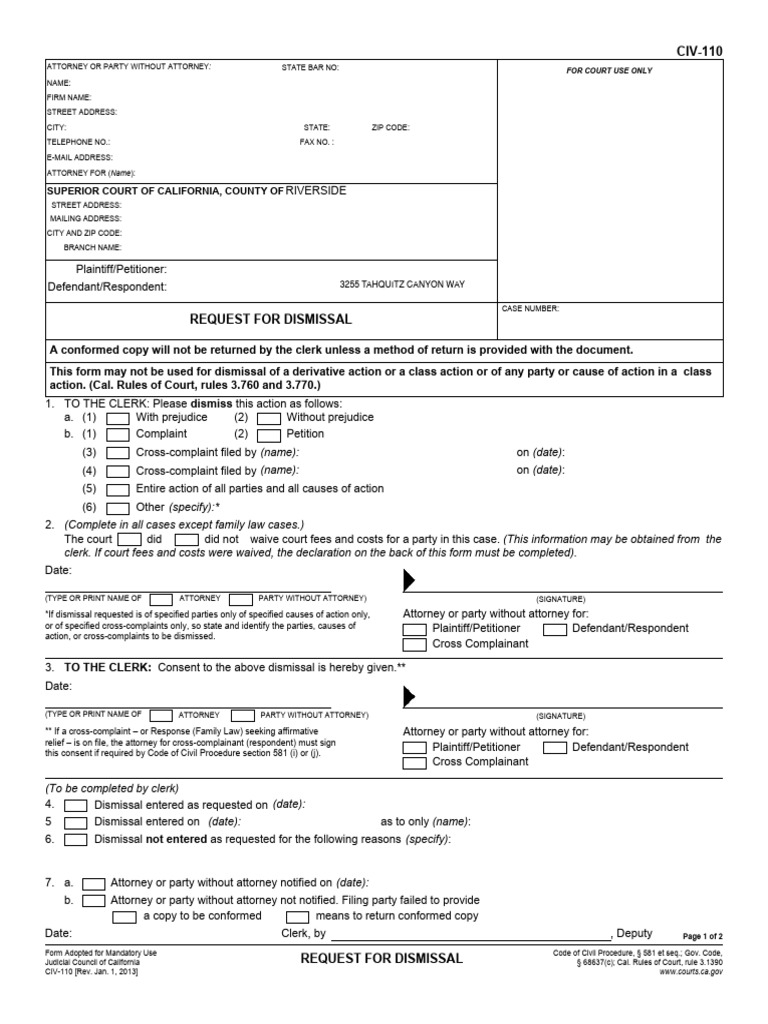 Judicial Council of California REQUEST FOR DISMISSAL § 68637(c); Cal. Rules of Court, rule 3.1390