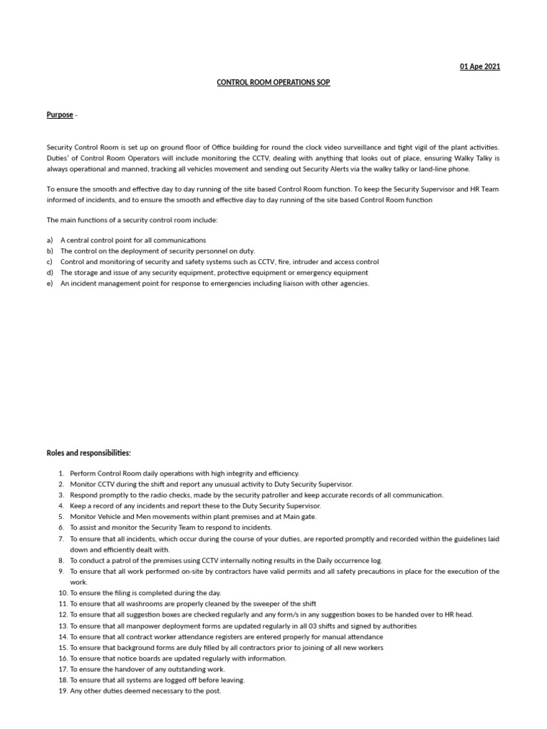 CONTROL ROOM OPERATIONS SOP