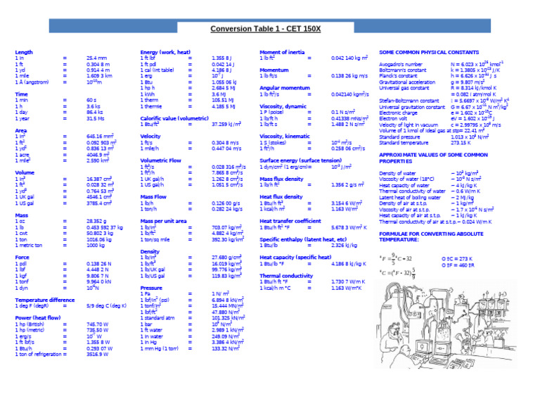 1 year = 31.5 Ms Calorific value (volumetric) 1 lb/ft h = 0.41338 mNs/m2 Electron volt eV = 1.602 x 10-19 J