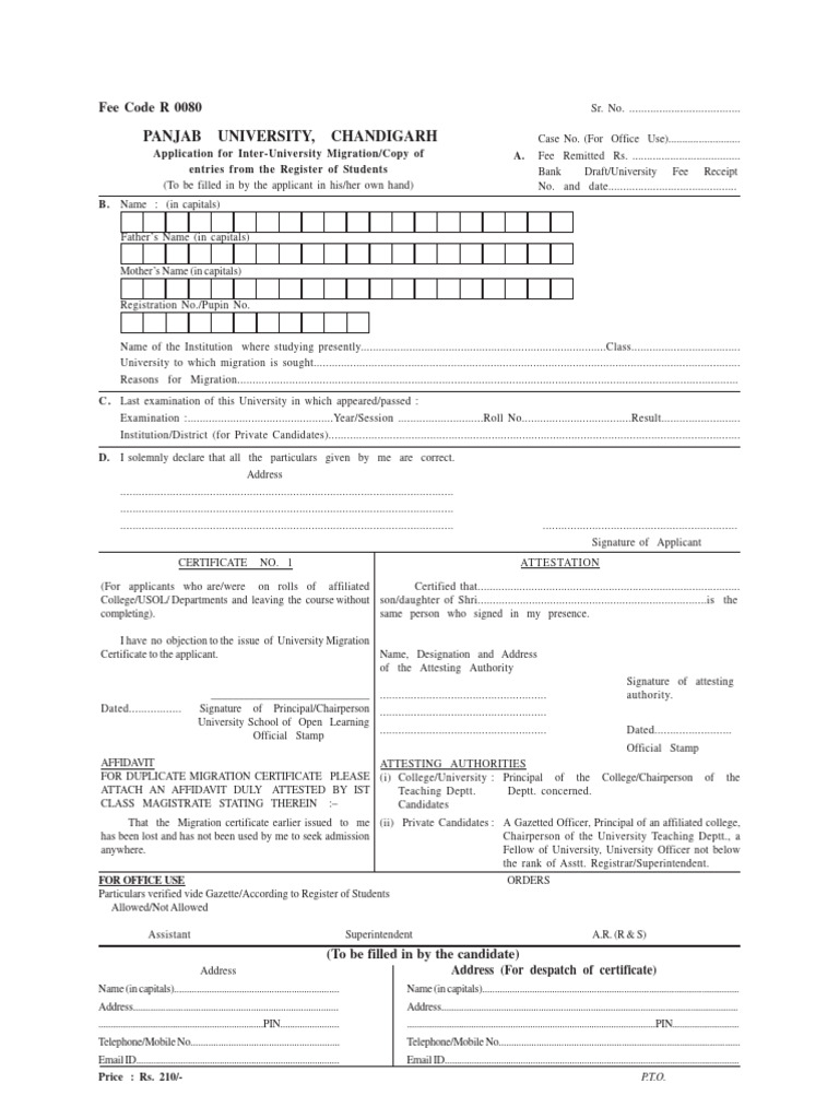 Application for Inter-University Migration/Copy of A. Fee Remitted Rs. .....................................