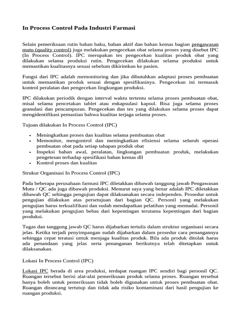 (In Process Control). IPC merupakan tes pengecekan kualitas produk obat yang