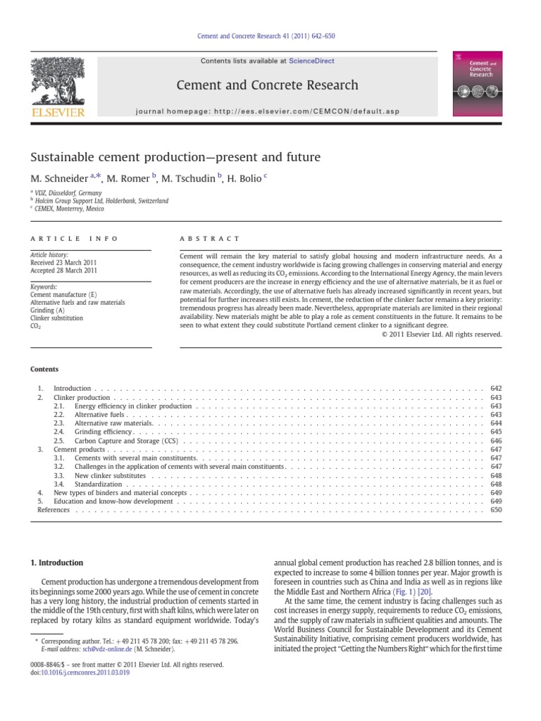 Cement will remain the key material to satisfy global housing and modern infrastructure needs. As a consequence, the cement industry worldwide is facing growing challenges in conserving material and energy resources, as well as reducing its CO2 emissions. According to the International Energy Agency, the main levers for cement producers are the increase in energy efciency and the use of alternative materials, be it as fuel or raw materials. Accordingly, the use of alternative fuels has already increased signicantly in recent years, but potential for further increases still exists. In cement, the reduction of the clinker factor remains a key priority: tremendous progress has already been made. Nevertheless, appropriate materials are limited in their regional availability. New materials might be able to play a role as cement constituents in the future. It remains to be seen to what extent they could substitute Portland cement clinker to a signicant degree. 2011 Elsevier Ltd. All rights reserved.
