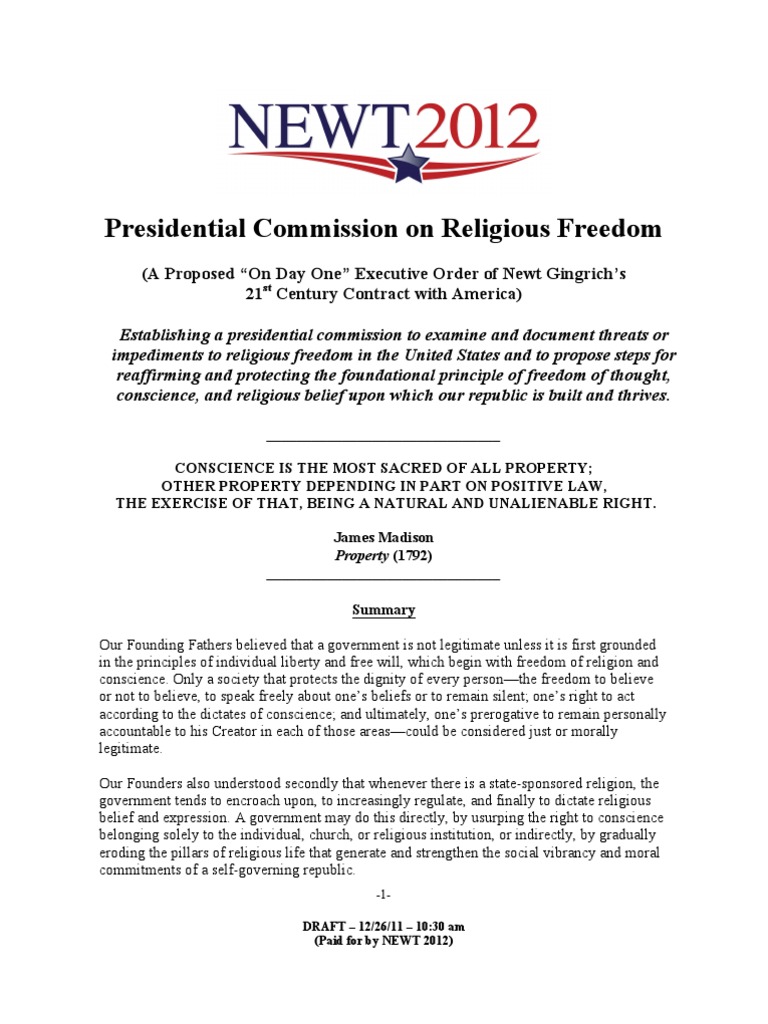 Establishing a presidential commission to examine and document threats or impediments to religious freedom in the United States and to propose steps for reaffirming and protecting the foundational principle of freedom of thought, conscience, and religious belief upon which our republic is built and thrives.