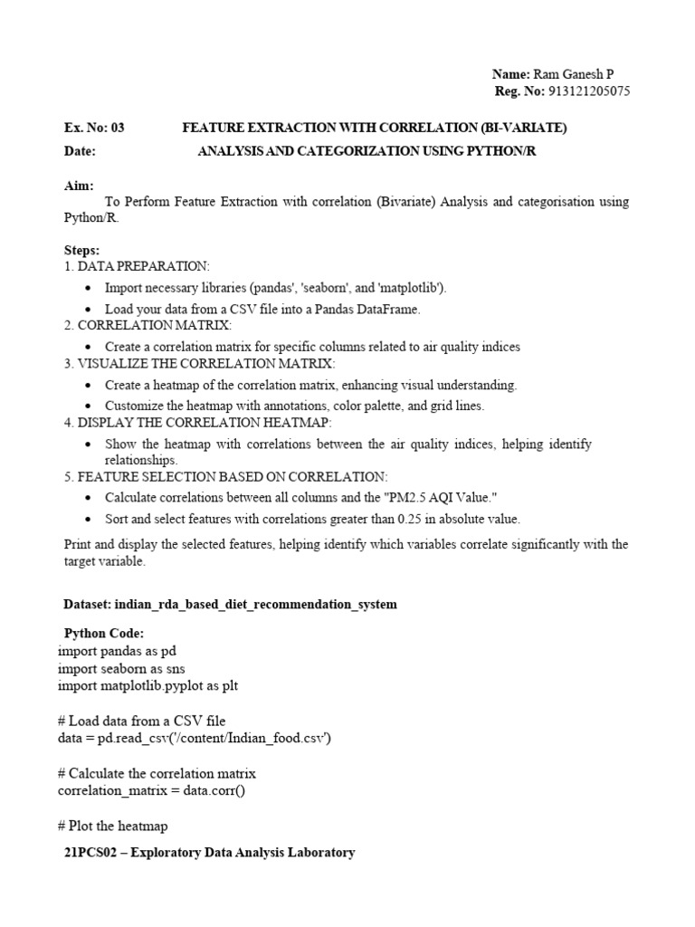 Ex. No: 03 FEATURE EXTRACTION WITH CORRELATION (BI-VARIATE)