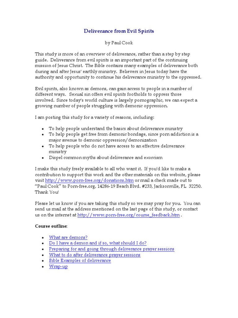 Deliverance from Evil Spirits Study By Paul Cook, www.porn-free.org