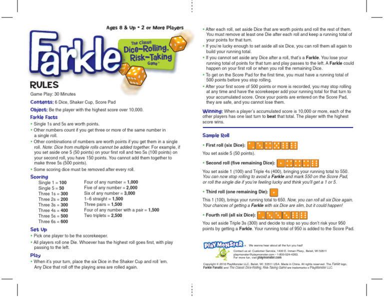 • When it’s your turn, place the six Dice in the Shaker Cup and roll ’em. Copyright © 2016 PlayMonster LLC, Beloit, WI 53511 USA. Made in China. All rights reserved. The Farkle logo,