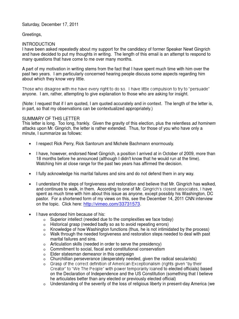 of former Speaker Newt Gingrich and have decided to put my thoughts in writing. The length of this email is an attempt to respond to many questions that have come to me over many months. A part of my motivation in writing stems from the fact that I have spent much time with him over the past two years. I am particularly concerned hearing people discuss some aspects regarding him about which they know very little. Those who disagree with me have every right to do so. I have little compulsion to try to persuade anyone. I am, rather, attempting to give explanation to those who are asking for insight. (Note: I request that if I am quoted, I am quoted accurately and in context. The length of the letter is, in part, so that my observations can be contextualized appropriately.) SUMMARY OF THIS LETTER This letter is long. Too long, frankly. Given the gravity of this election, plus the relentless ad hominem attacks upon Mr. Gingrich, the letter is rather extended. Thus, for those of you who have only a minute, I summarize as follows: I respect Rick Perry, Rick Santorum and Michele Bachmann enormously. I have, however, endorsed Newt Gingrich, a position I arrived at in October of 2009, more than 18 months before he announced (although I didn't know that he would run at the time). Watching him at close range for the past two years has affirmed the decision. I fully acknowledge his marital failures and sins and do not defend them in any way. I understand the steps of forgiveness and restoration and believe that Mr. Gingrich has walked, and continues to walk, in them. According to one of Mr. Gingrichs closest associates, I have spent as much time with him about this issue as anyone, except possibly his Washington, DC pastor. For a shortened form of my views on this, see the December 14, 2011 CNN interview on the topic. Click here: http://vimeo.com/33731573. I have endorsed him because of his: o Superior intellect (needed due to the complexities we face today) o Historical grasp (needed badly so as to avoid repeating errors) o Knowledge of how Washington functions (thus, he is not intimidated by the process) o Walk through the needed forgiveness and restoration steps needed to deal with past marital failures and sins. o Articulation skills (needed in order to serve the presidency) o Commitment to social, fiscal and constitutional conservatism o Elder statesman demeanor in this campaign o Churchillian perseverance (desperately needed, given the radical secularists) o Grasp of the correct definition of American Exceptionalism (rights given by their Creator to We The People with power temporarily loaned to elected officials) based on the Declaration of Independence and the US Constitution (something that I believe he articulates better than any elected or previously elected official) o Understanding of the severity of the loss of religious liberty in present-day America (we