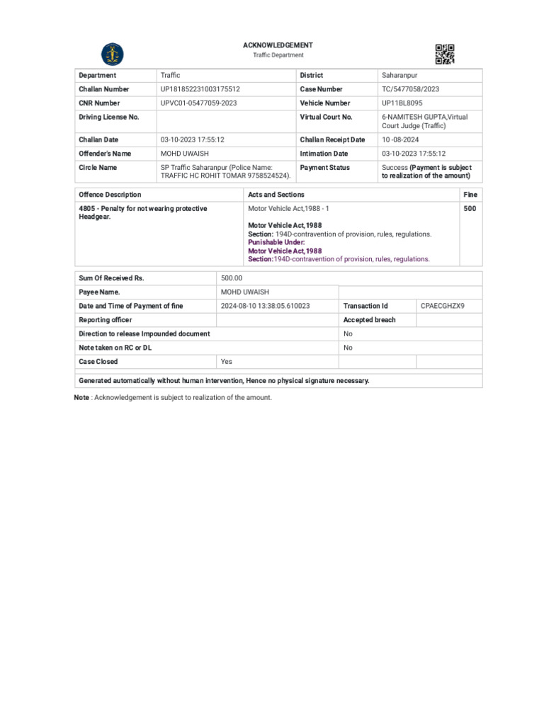 Circle Name SP Traffic Saharanpur (Police Name: Payment Status Success (Payment is subject