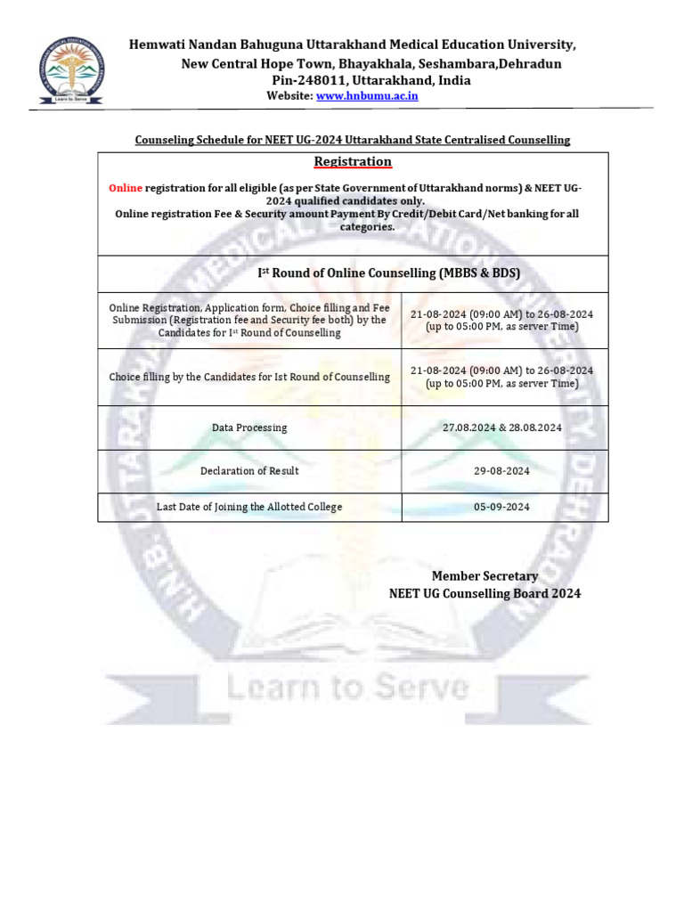 Counseling Schedule for NEET UG-2024 Uttarakhand State Centralised Counselling