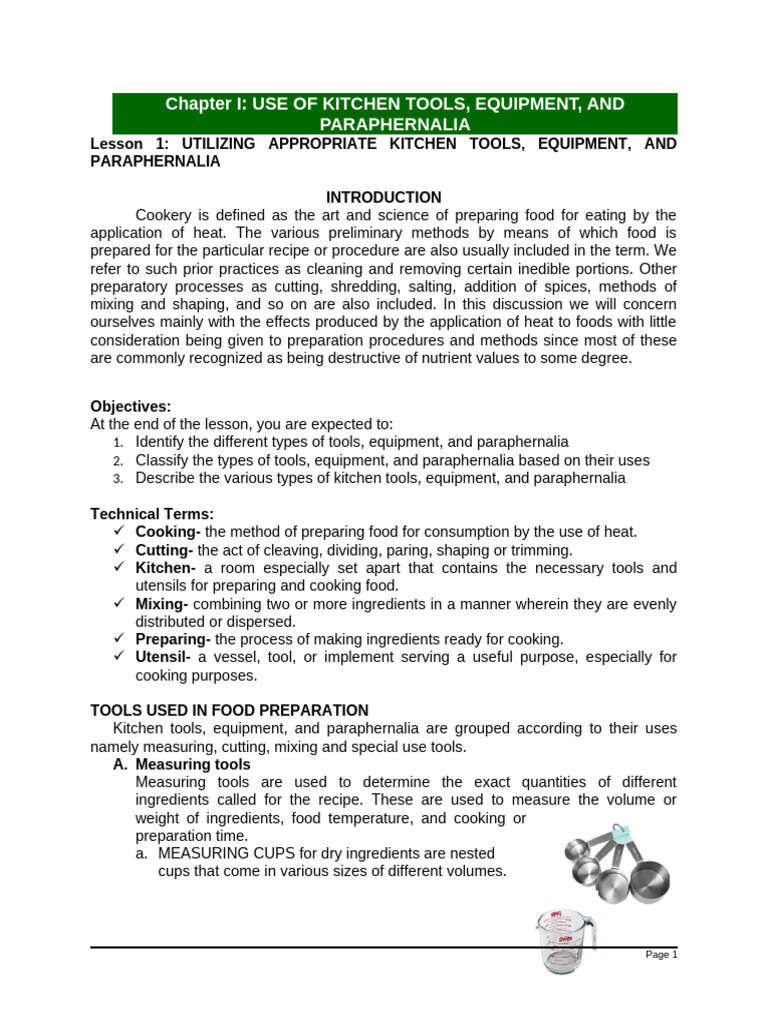 Lesson 1: UTILIZING APPROPRIATE KITCHEN TOOLS, EQUIPMENT, AND