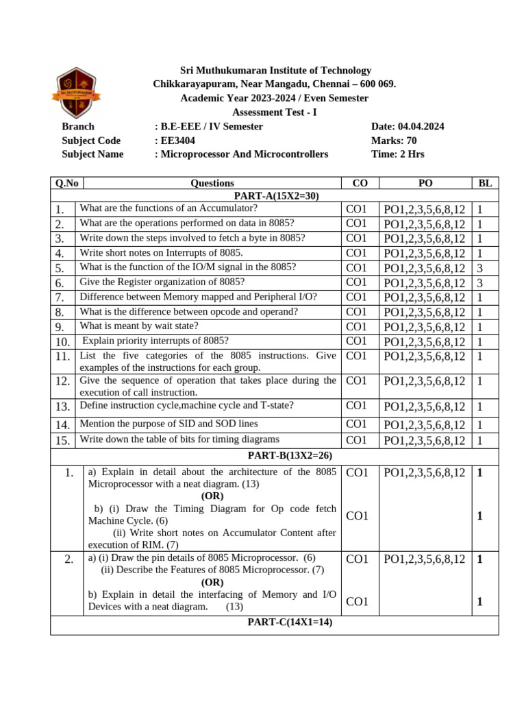 1. List out the advantages of Microprocessor. CO1 PO1,2,3,5,6,8,12 1