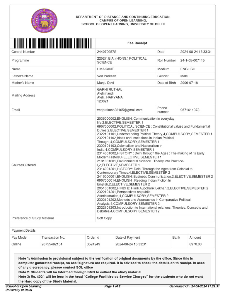 School of Open Learning Page 1 of 2 Generated On: 24-08-2024 11:21:31