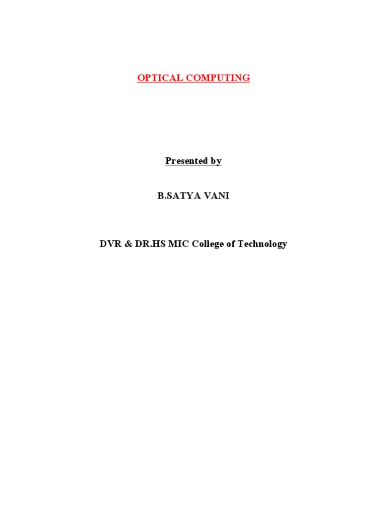 The pressing need for optical technology stems from the fact that todays computers are limited by the time response of electronic circuits. A solid transmission medium limits both the speed and volume of signals, as well as building up heat that damages components .One of the theoretical limits on how fast a computer can function is given by Einsteins principle that signal cannot propagate faster than speed of light. So to make computers faster, their components must be smaller and there by decrease the distance between them. This has resulted in the development of very large scale integration (VLSI) technology, with smaller device dimensions and greater complexity. The smallest dimensions of VLSI nowadays are about 0.08mm. Despite the incredible progress in the development and refinement of the basic technologies over the past decade, there is growing concern that these technologies may not be capable of solving the computing problems of even the current millennium. The speed of computers was achieved by miniaturizing electronic components to a very small micron-size scale, but they are limited not only by the speed of electrons in matter but also by the increasing density of interconnections necessary to link the electronic gates on microchips. The optical computer comes as a solution of miniaturization problem.Optical data processing can perform several operations in parallel much faster and easier than electrons. This parallelism helps in staggering computational power. For example a calculation that takes a conventional electronic computer more than 11 years to complete could be performed by an optical computer in a single hour. Any way we can realize that in an optical computer, electrons are replaced by photons, the subatomic bits of electromagnetic radiation that make up light.
