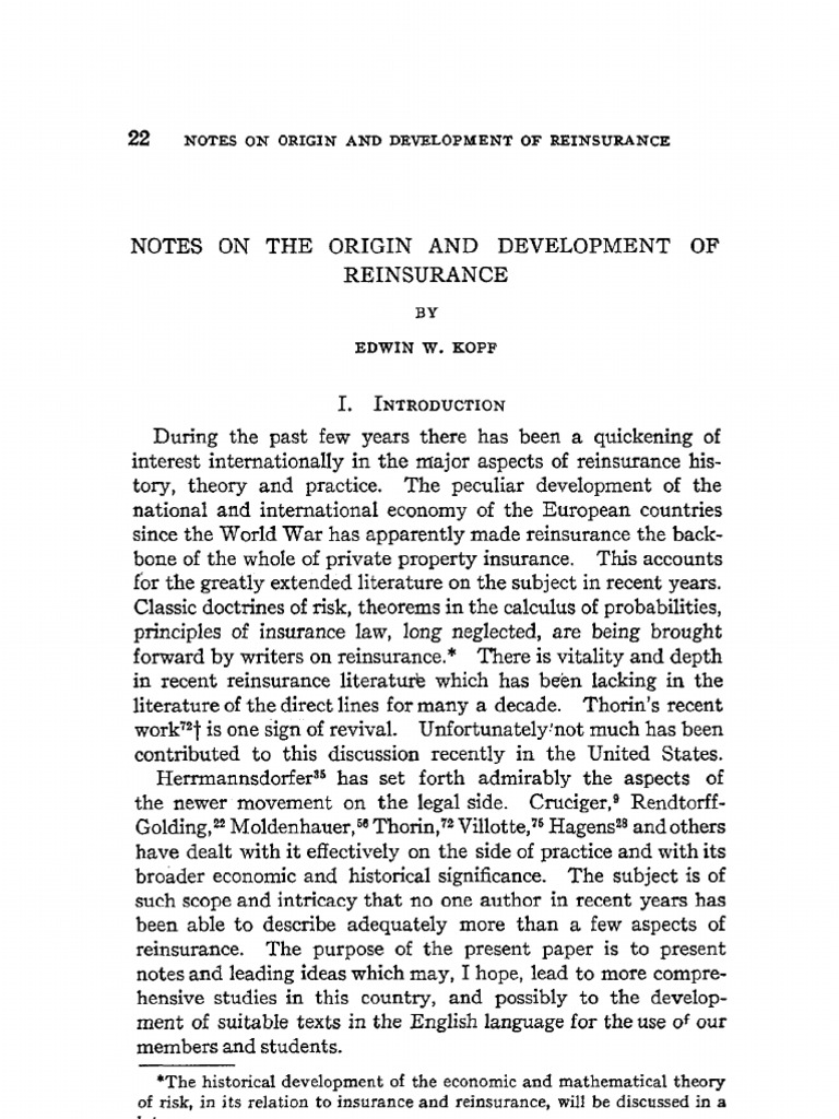 During the past few years there has been a quickening of interest internationally in the major aspects of reinsurance history, theory and practice. The peculiar development of the national and international economy of the European countries since the World War has apparently made reinsurance the backbone of the whole of private property insurance. This accounts fbr the greatly extended literature on the subject in recent years. Classic doctrines of risk, theorems in the calculus of probabilities, principles of insurance law, long neglected, are being brought forward by writers on reinsurance.* There is vitality and depth in recent reinsurance literature which has been lacking in the literature of the direct lines for many a decade. Thorin's recent work~2t is one sign of revival. Unfortunately:not much has been contributed to this discussion recently in the United States. Heri-mannsdorfer"5 has set forth admirably the aspects of the newer movement on the legal side. Crueiger, 9 RendtorffGolding$2 Moldenhauer, 56Thorin$ 2Villotte, 75Hagens 2s and others have dealt with it effectively on the side of practice and with its broader economic and historical significance. The subject is of such scope and intricacy that no one author in recent years has been able to describe adequately more than a few aspects of reinsurance. The purpose of the present paper is to present notes and leading ideas which may, I hope, lead to more comprehensive studies in this country, and possibly to the development of suitable texts in the English language for the use o~ our members and students.