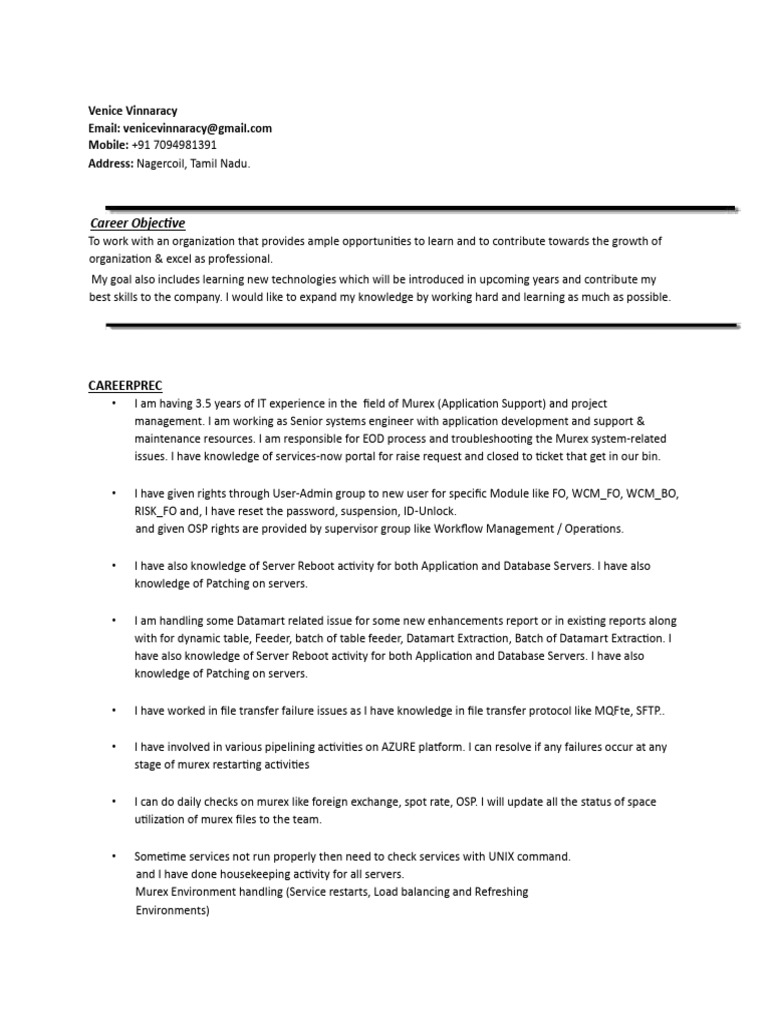 • I am having 3.5 years of IT experience in the field of Murex (Application Support) and project