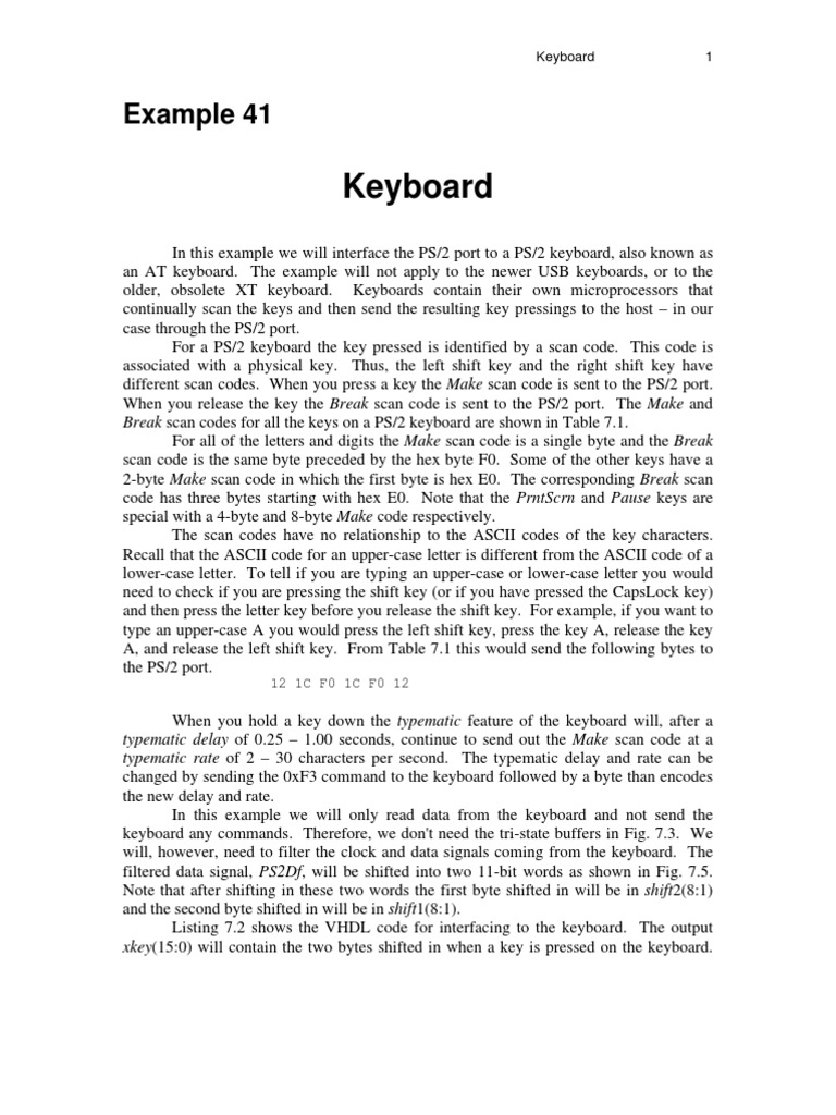 Table 7.1 Keyboard Scan Codes Key A B C D E F G H I J K L M N O P Q R S T U V W X Y Z 0 1 2 3 4 5 6 7 8 9 Make 1C 32 21 23 24 2B 34 33 43 3B 42 4B 3A 31 44 4D 15 2D 1B 2C 3C 2A 1D 22 35 1A 45 16 1E 26 25 2E 36 3D 3E 46 Break F0,1C F0,32 F0,21 F0,23 F0,24 F0,2B F0,34 F0,33 F0,43 F0,3B F0,42 F0,4B F0,3A F0,31 F0,44 F0,4D F0,15 F0,2D F0,1B F0,2C F0,3C F0,2A F0,1D F0,22 F0,35 F0,1A F0,45 F0,16 F0,1E F0,26 F0,25 F0,2E F0,36 F0,3D F0,3E F0,46 Key ` = \ BKSP SPACE TAB CAPS L Shift R Shift L Ctrl R Ctrl L Alt R Alt L GUI R GUI Apps Enter ESC Scroll Insert Home Page Up Page Dn Delete End [ ] ; ' , . / PrntScrn Make 0E 4E 55 5D 66 29 0D 58 12 59 14 E0,14 11 E0,11 E0,1F E0,27 E0,2F 5A 76 7E E0,70 E0,6C E0,7D E0,7A E0,71 E0,69 54 5B 4C 52 41 49 4A E0,7C, E0,12 Break F0,0E F0,4E F0,55 F0,5D F0,66 F0,29 F0,0D F0,58 F0,12 F0,59 F0,14 E0,F0,14 F0,11 E0,F0,11 E0,F0,1F E0,F0,27 E0,F0,2F F0,5A F0,76 F0,7E E0,F0,70 E0,F0,6C E0,F0,7D E0,F0,7A E0,F0,71 E0,F0,69 F0,54 F0,5B F0,4C F0,52 F0,41 F0,49 F0,4A E0,F0,7C, E0,F0,12 Key F1 F2 F3 F4 F5 F6 F7 F8 F9 F10 F11 F12 Num KP / KP * KP KP + KP EN KP . KP 0 KP 1 KP 2 KP 3 KP 4 KP 5 KP 6 KP 7 KP 8 KP 9 U Arrow L Arrow D Arrow R Arrow Pause Make 05 06 04 0C 03 0B 83 0A 01 09 78 07 77 E0,4A 7C 7B 79 E0,5A 71 70 69 72 7A 6B 73 74 6C 75 7D E0,75 E0,6B E0,72 E0,74 E1,14, 77,E1, F0,14, F0,77, Break F0,05 F0,06 F0,04 F0,0C F0,03 F0,0B F0,83 F0,0A F0,01 F0,09 F0,78 F0,07 F0,77 E0,F0,4A F0,7C F0,7B F0,79 E0,F0,5A F0,71 F0,70 F0,69 F0,72 F0,7A F0,6B F0,73 F0,74 F0,6C F0,75 F0,7D E0,F0,75 E0,F0,6B E0,F0,72 E0,F0,74 None