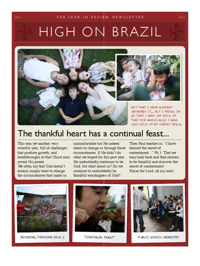 During our time in Brazil this year of 2011, we can say it was a very eventful year. Weve ministered in schools and also prepared material to be approved by the city council for the school ministry, and ministered to families. We have translated material to be used by Harvest Brazil, an organization that supports and equips churches nationwide to transform society with the principles found in the Word of God. We received 2 mission teams from America, were very blessed by the coming of Matt Barker from Living Word Church, who stayed with us for about 6 weeks. Besides the seminar on parenting in Santos, Sao Paulo, we were also able to reach out to many relatives there and strengthen the ones that had gotten saved in our prior trips. We gave support to Betesda, a local drug rehab center, helped at MANG Church as we were needed, interpreted in many churches for foreign speakers both from America and Argentina, helped young mothers with their pregnancies and births, and dealt with many Brazilian sicknesses and challenging situations that appear simply by being foreigners here. Although Fabio was born in Brazil, he left when was young and thus, acquired an accent speaking Portuguese and doesnt understand the local ways of doing many things. This causes a real challenge as he thought he was from here - but people dont think so! Elizabeth now speaks Portuguese very uently and has done very well dealing with the cultural differences and challenges. The children have been real troopers understanding well why they are in Brazil, and being the reason why so many doors are opened to us to minister to many families.