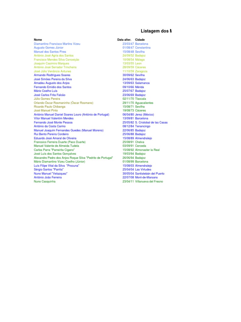 Nome Diamantino Francisco Martins Vizeu Augusto Gomes Jnior Manuel dos Santos Pires Antnio Jos Agria dos Santos Francisco Mendes Silva Conceio Joaquim Casimiro Marques Antnio Jos Serrador Trincheira Jos Jlio Venncio Antunes Armando Rodtrigues Soares Jos Simes Pereira da Silva Amadeu Augusto dos Anjos Fernando Emdio dos Santos Mrio Coelho Lus Jos Carlos Frita Falco Jlio Gomes Pereira Orlando scar Rosmaninho (scar Rosmano) Ricardo Paulo Chibanga Jos Manuel Pinto Antnio Manuel Daniel Soares Louro (Antnio de Portugal) Vtor Manuel Valentim Mendes Fernando Jos Monte Pessoa Antnio da Costa Carmo Manuel Joaquim Fernandes Guedes (Manuel Moreno) Rui Bento Pereira Cordeiro Eduardo Jos Amaral de Oliveira Francsico Ferreira Duarte (Paco Duarte) Manuel Valente de Almeida Tudela Carlos Parra "Parreirita Cigano" Jos Lus dos Santos Gonalves Alexandre Pedro dos Anjos Roque Silva "Pedrito de Portugal" Mrio Diamantino Vizeu Coelho (Jnior) Lus Filipe Vital da Silva "Procuna" Srgio Santos "Parrita" Nuno Manuel "Velazquez" Antnio Joo Ferreira Nuno Casquinha Data alter. 23/03/47 01/08/47 15/08/48 24/09/52 10/08/54 13/03/55 28/09/59 11/10/59 30/09/62 24/06/63 13/09/63 09/10/66 25/07/67 23/06/69 02/11/70 29/11/70 15/08/71 19/08/73 06/04/80 13/09/81 25/05/82 08/12/84 22/06/85 25/06/88 15/08/89 25/08/91 03/09/91 15/08/92 19/03/94 26/06/94 01/08/99 15/08/03 25/04/04 30/05/04 22/07/08 23/04/11 Cidade Barcelona Constantina Sevilha Badajoz Mlaga Leon Cceres Zaragoza Sevilha Badajoz Salamanca Mrida Badajoz Badajoz Tlaxcala Aguacalientes Sevilha Cceres Jerez (Mxico) Barcelona S. Cristobal de las Casas Tenancingo Badajoz Badajoz Almendralejo Chelva Cerceda Almonaster la Real Badajoz Badajoz Barcelona Almendralejo Las Virtudes Santistebn del Puerto Mont-de-Marsans Villanueva del Fresno