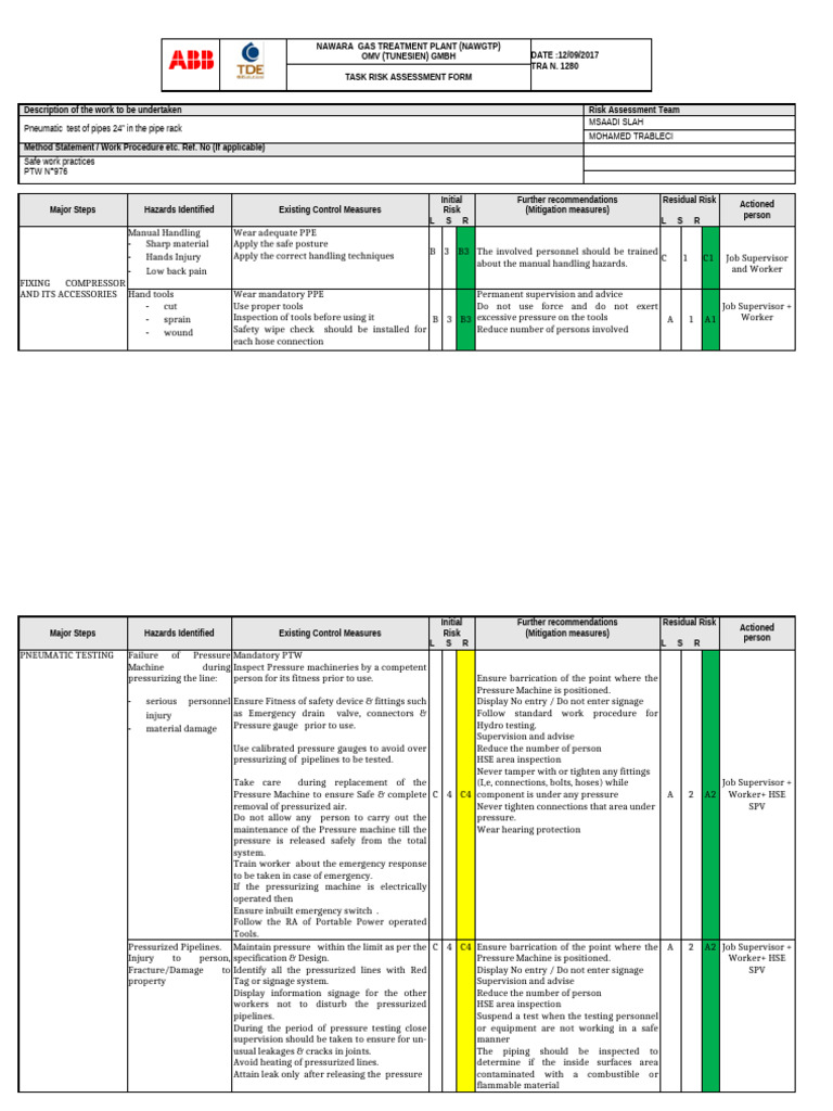 For additional information please refer to document NAWGTP-ABB-NGTP-000-HS-PLA-00018 - Task Risk Assessment Procedure Signature ____________________