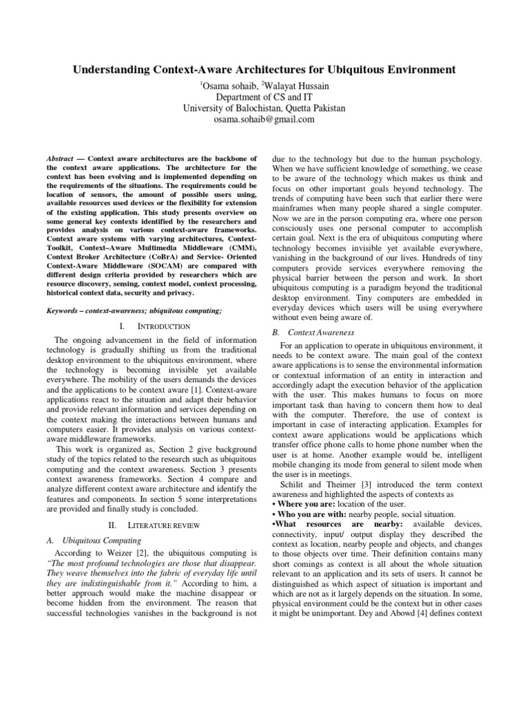 due to the technology but due to the human psychology. When we have sufficient knowledge of something, we cease to be aware of the technology which makes us think and focus on other important goals beyond technology. The trends of computing have been such that earlier there were mainframes when many people shared a single computer. Now we are in the person computing era, where one person consciously uses one personal computer to accomplish certain goal. Next is the era of ubiquitous computing where technology becomes invisible yet available everywhere, vanishing in the background of our lives. Hundreds of tiny computers provide services everywhere removing the physical barrier between the person and work. In short ubiquitous computing is a paradigm beyond the traditional desktop environment. Tiny computers are embedded in everyday devices which users will be using everywhere without even being aware of. B. Context Awareness For an application to operate in ubiquitous environment, it needs to be context aware. The main goal of the context aware applications is to sense the environmental information or contextual information of an entity in interaction and accordingly adapt the execution behavior of the application with the user. This makes humans to focus on more important task than having to concern them how to deal with the computer. Therefore, the use of context is important in case of interacting application. Examples for context aware applications would be applications which transfer office phone calls to home phone number when the user is at home. Another example would be, intelligent mobile changing its mode from general to silent mode when the user is in meetings. Schilit and Theimer [3] introduced the term context awareness and highlighted the aspects of contexts as Where you are: location of the user. Who you are with: nearby people, social situation. What resources are nearby: available devices, connectivity, input/ output display they described the context as location, nearby people and objects, and changes to those objects over time. Their definition contains many short comings as context is all about the whole situation relevant to an application and its sets of users. It cannot be distinguished as which aspect of situation is important and which are not as it largely depends on the situation. In some, physical environment could be the context but in other cases it might be unimportant. Dey and Abowd [4] defines context