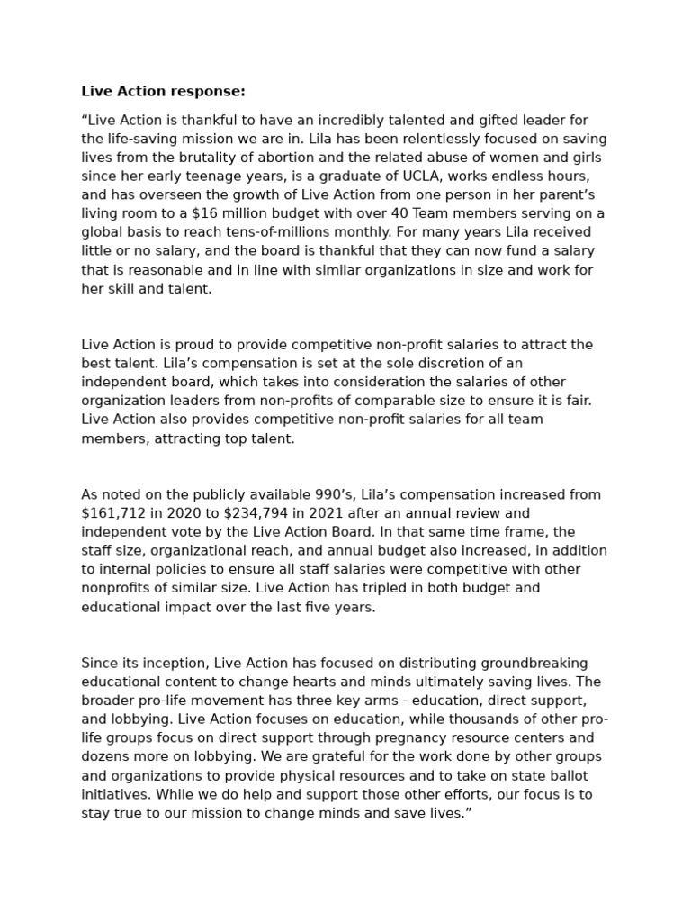 “Live Action is thankful to have an incredibly talented and gifted leader for the life-saving mission we are in. Lila has been relentlessly focused on savinglives from the brutality of abortion and the related abuse of women and girls since her early teenage years, is a graduate of UCLA, works endless hours, and has overseen the growth of Live Action from one person in her parent’s living room to a $16 million budget with over 40 Team members serving on aglobal basis to reach tens-of-millions monthly. For many years Lila received little or no salary, and the board is thankful that they can now fund a salary that is reasonable and in line with similar organizations in size and work for her skill and talent.Live Action is proud to provide competitive non-prot salaries to attract the best talent. Lila’s compensation is set at the sole discretion of an independent board, which takes into consideration the salaries of other organization leaders from non-prots of comparable size to ensure it is fair. Live Action also provides competitive non-prot salaries for all team members, attracting top talent.As noted on the publicly available 990’s, Lila’s compensation increased from $161,712 in 2020 to $234,794 in 2021 after an annual review and independent vote by the Live Action Board. In that same time frame, the sta size, organizational reach, and annual budget also increased, in additionto internal policies to ensure all sta salaries were competitive with other nonprots of similar size. Live Action has tripled in both budget and educational impact over the last ve years.Since its inception, Live Action has focused on distributing groundbreaking educational content to change hearts and minds ultimately saving lives. The broader pro-life movement has three key arms - education, direct support, and lobbying. Live Action focuses on education, while thousands of other pro-life groups focus on direct support through pregnancy resource centers and dozens more on lobbying. We are grateful for the work done by other groups and organizations to provide physical resources and to take on state ballot initiatives. While we do help and support those other eorts, our focus is to stay true to our mission to change minds and save lives.”