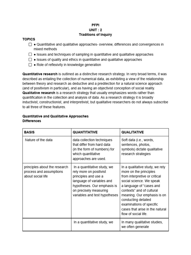 ● Issues of quality and ethics in quantitative and qualitative approaches