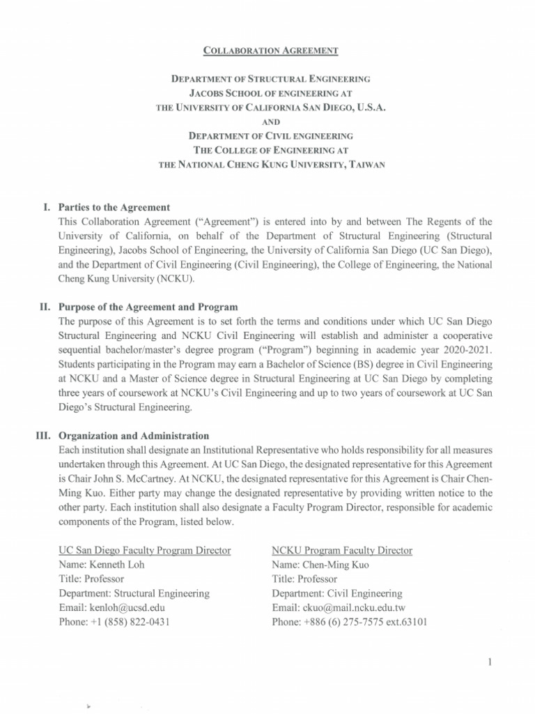 Structural Engineering and NCKU Civil Engineering will establish and administer a cooperative