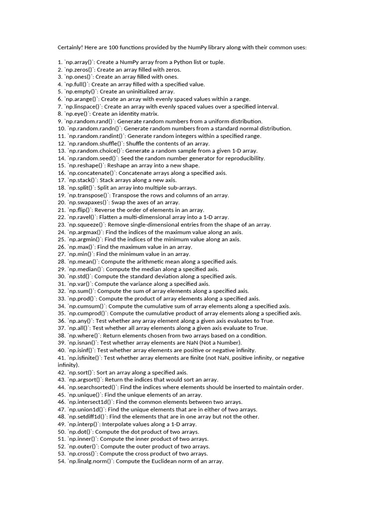 Here are 100 functions provided by the NumPy library along with their common uses: