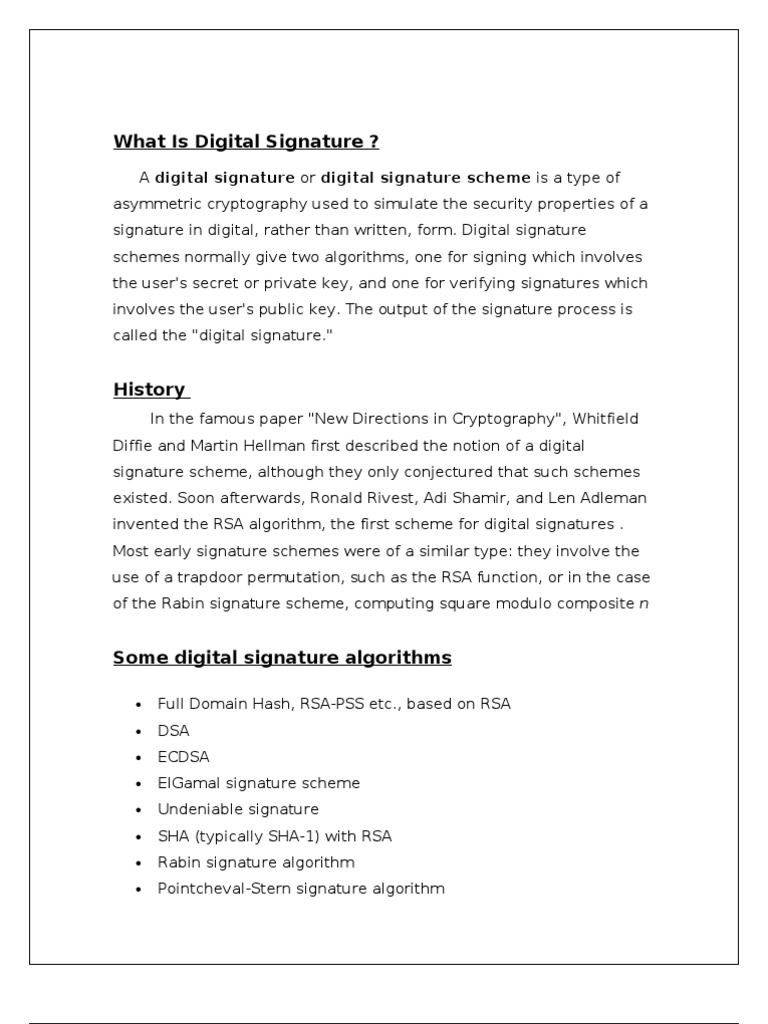 In the famous paper "New Directions in Cryptography", Whitfield Diffie and Martin Hellman first described the notion of a digital signature scheme, although they only conjectured that such schemes existed. Soon afterwards, Ronald Rivest, Adi Shamir, and Len Adleman invented the RSA algorithm, the first scheme for digital signatures . Most early signature schemes were of a similar type: they involve the use of a trapdoor permutation, such as the RSA function, or in the case of the Rabin signature scheme, computing square modulo composite n