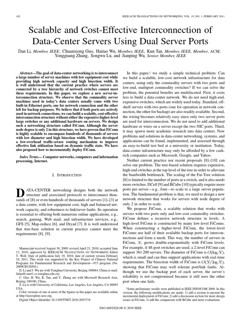 In this paper,1 we study a simple technical problem: Can we build a scalable, low-cost network infrastructure for data centers, using only the commodity servers with two ports and low-end, multiport commodity switches? If we can solve the problem, the potential benets are multifaceted. First, it costs less to build a data-center network. We do not need high-end, expensive switches, which are widely used today. Standard, offshelf servers with two ports (one for operation in network connection, the other for backup) are also readily available. Second, the wiring becomes relatively easy since only two server ports are used for interconnection. We do not need to add additional hardware or wires on a server except the two NIC ports. Third, it may spawn more academic research into data centers. New problems and solutions in data-center networking, systems, and applications can be found, implemented, and assessed through an easy-to-build test bed at a university or institution. Today, data-center infrastructure may only be afforded by a few cashrich companies such as Microsoft, Google, and Yahoo. Neither current practice nor recent proposals [8][10] can solve our problem. The tree-based solution requires expensive, high-end switches at the top level of the tree in order to alleviate the bandwidth bottleneck. The scaling of the Fat-Tree solution [8] is limited to the number of ports at a switch, and it also needs more switches. DCell [9] and BCube [10] typically require more ports per servere.g., fourto scale to a large server population. The fundamental problem is that, we need to design a new network structure that works for servers with node degree of only 2 in order to scale. We propose FiConn, a scalable solution that works with servers with two ports only and low-cost commodity switches. FiConn denes a recursive network structure in levels. A high-level FiConn is constructed by many low-level FiConns. When constructing a higher-level FiConn, the lower-level FiConns use half of their available backup ports for interconnections and form a mesh. This way, the number of servers in FiConn, , grows double-exponentially with FiConn levels. For example, if 48-port switches are used, a 2-level FiConn can , support 361 200 servers. The diameter of FiConn is which is small and can thus support applications with real-time , requirements. The bisection width of FiConn is showing that FiConn may well tolerate port/link faults. Although we use the backup port of each server, the servers reliability is not compromised because it still uses the other port when one fails.