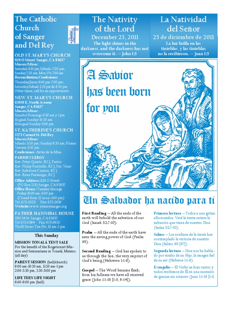 Saturday, December 24 Sbado 2:15 pm-Confessions (Fr. Rene) O 6:30 pm-Confessions (Fr. Philip) O Street 7:00 pm+Padilla Children (Fr. Rene) Bethel 8:15 pm-Las Posadas/iglesia grande 9:00 pm+Carmen Cantu (Fr. Philip) Bethel 10:00 pm+Misa en espaol (Fr. Sal) Del Rey 11:00 pm+Tomas, Ricardo, Santiago Mendoza (Fr. Peter) Bethel Sunday, December 25 Domingo THE NATIVITY OF OUR LORD LA NATIVIDAD DEL SEOR 7:30 am-Pro populo (Fr. Philip) O Street 8:30 am+Fernando Gloria Sr. (Fr. Sal) Bethel 9:30 am+Christine Lopez (Fr. Rene) Del Rey 10:30 am+Gilbert Gonzalez (Fr. Peter) Bethel 1 pm+Enrique Madaleno (Fr. Peter) Bethel 5 pm+Rusty Garza (Fr. Philip) Bethel Monday, December 26 Lunes St. Stephen, first martyr San Esteban, protomartir 6:40 am-Morning Prayer 7 am+Christmas Flower Offering (Fr. Sal) O Street Tuesday, December 27 Martes St. John, apostle San Juan, apstol 6:40 am-Morning Prayer 7 am+Richard Muoz, Jr. (Fr. Sal) O Street Wednesday, Dec. 28 Miercoles The Holy Innocents, martyrs