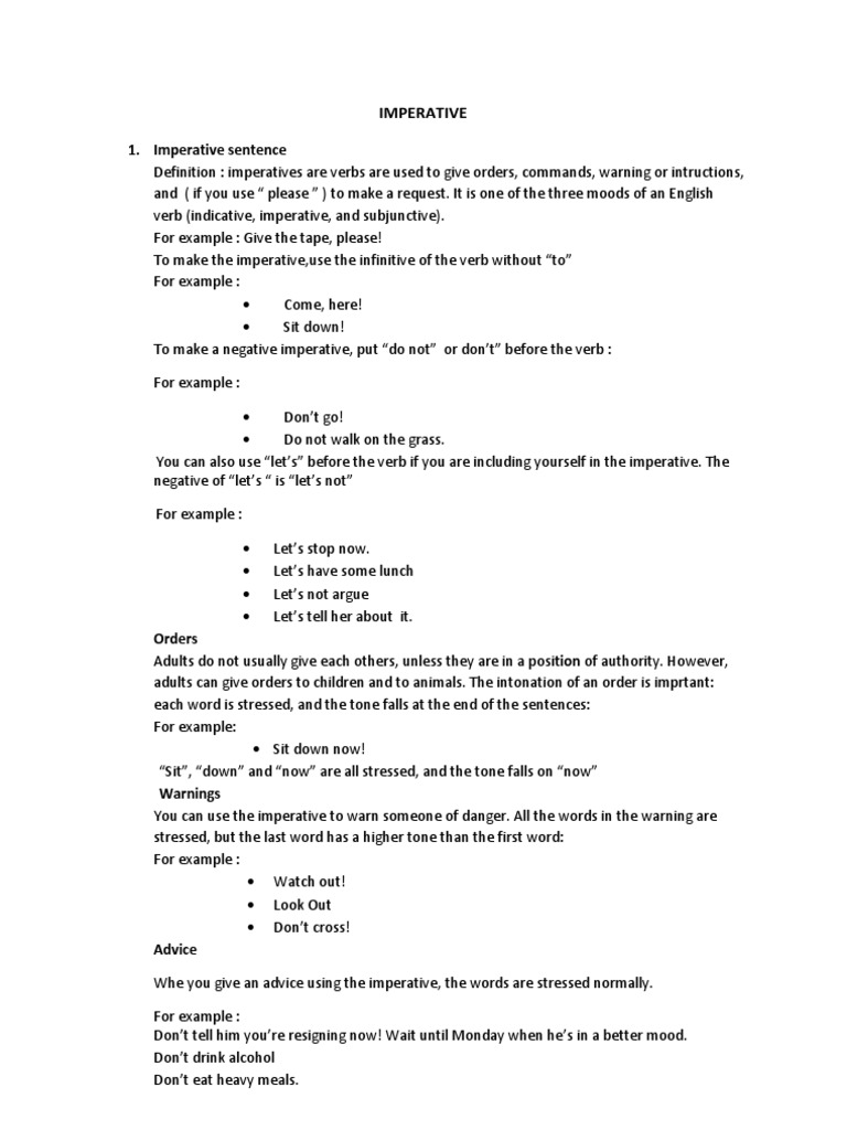 1. Imperative sentence Definition : imperatives are verbs are used to give orders, commands, warning or intructions, and ( if you use please ) to make a request. It is one of the three moods of an English verb (indicative, imperative, and subjunctive). For example : Give the tape, please! To make the imperative,use the infinitive of the verb without to For example : Come, here! Sit down! To make a negative imperative, put do not or dont before the verb : For example : Dont go! Do not walk on the grass. You can also use lets before the verb if you are including yourself in the imperative. The negative of lets is lets not For example : Lets stop now. Lets have some lunch Lets not argue Lets tell her about it.