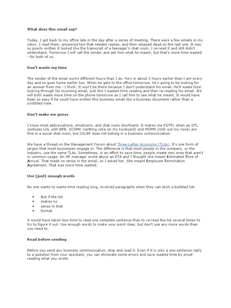 There were a few emails in my inbox. I read them, answered two that needed replies, and then stopped dead on the last one. It was so poorly written it looked like the transcript of a teenager's chat room. I re-read it and still didn't understand. Tomorrow I will call the sender and ask him what he meant, but that's more time wasted - for both of us. Don't waste my time The sender of the email works different hours than I do. He's in about 3 hours earlier than I am every day and so goes home earlier too. When he gets to the office tomorrow, he's going to be looking for an answer from me - I think. It won't be there because I don't understand his email. He'll waste time looking through his incoming email, just like I wasted time reading and then re-reading his email. We will both waste more time on the phone tomorrow as I call him to see what he meant. It would have been so easy if he could have written this business email like a business document rather than a scribbled note. Don't make me guess I know most abbreviations, emoticons, and chat room shorthand. It makes me ROTFL when an OTL confuses LOL with BRB. SCOMK (spitting coke on my keyboard) and MOMN (milk out my nose) are fine in a social chat room, but CUL8R does not belong in a business communication. We have a thread on the Management Forum about Three-Letter-Acronyms (TLAs). It's one form of jargon that most businesses engage in. The difference is that most people in the company, or the industry, use the same TLAs. Sometimes, in an effort to save time, people create new ones that aren't in common usage. An HR manager wrote about an ETA and I thought she meant Estimated Time of Arrival. That made no sense in the email, so I asked her. She meant Employee Termination Agreement. That was more time wasted. Use (just) enough words No one wants to waste time reading long, involved paragraphs when they can skim a bulleted list.