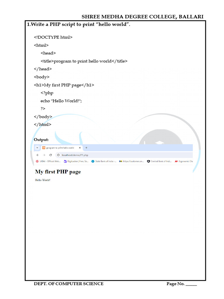 1.Write a PHP script to print “hello world”.