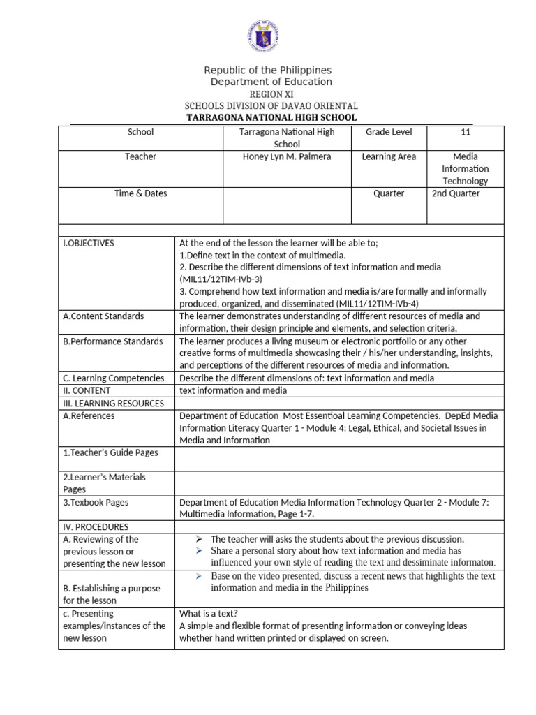 Teacher Honey Lyn M. Palmera Learning Area Media