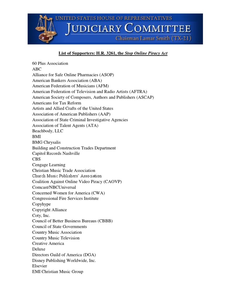 List of Supporters: H.R. 3261, The Stop Online Piracy Act